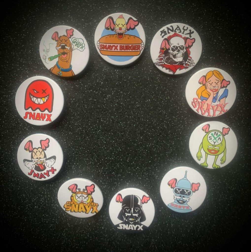 People love a badge, it’s crazy. I hadn’t realized, but there’s these old punk badge groups on Facebook where people are totally obsessed by badges from the 70’s and 80’s and they’ve become collectors items. I think it’s absolutely mind blowing that these little bits of metal and plastic become these little gems that people are absolutely obsessed with. I love it! It’s so much fun! When Snayx play, they have a song called ‘Fakes’, which they normally play right at the end of the show, and that’s when I go out and hand badges out to people in the audience, and people just so shocked to be given a badge. And you can just see those massive grin on their face when they see it’s a Snayx’s badge. It makes people happy.