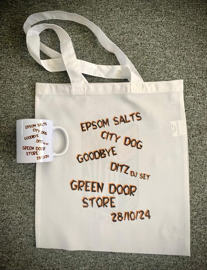 We bought a load of sublimation equipment. We bought a sublimation printer, a mug press, and heat press, and we’re just about to get a hat press and a cutting machine as well, so we can actually cut out the heat transfer material which is a bit better quality than just the sublimation printing. We bought all this equipment with the idea that if we produce the mugs and the tote bags and the posters and hats, we can say to bands this is what we can do. Normally we make a sample to show people. Then the deal is if they want to go ahead and then sell these, and split the money with us, then we’ll take out of our half the cost of the materials, time and labour involved. As it works out, the bands end up making more out of it than than we do. It’s not really a money making thing, we’re trying to help bands, but our plan is to keep ploughing everything back in and try to get it to a point where we can afford a direct to garment printer, so that we can start to do t shirts as well. The size of the bands that we’re working with are really small. If we can make say 10 tote bags and 10 mugs i.e. really small runs at the moment, that gives them an income. It’s all a learning curve for us as well. Some of the bands we’re doing the artwork and others are using their artwork, and but it’s learning as we go along as well.