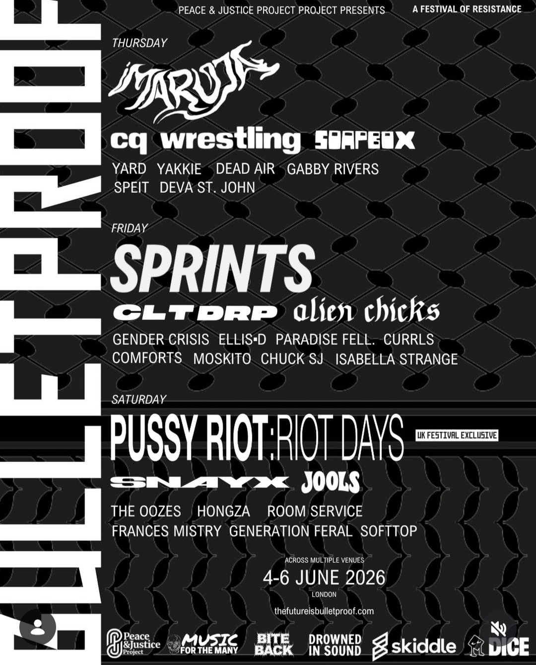 “We are proud to finally launch the Bulletproof line-up – this is the result of over a year of planning, discussions, research and hard work. We are delighted that Maruja, SPRINTS and Pussy Riot: Riot Days have agreed to join the inaugural Bulletproof line-up. Each act has a proven track record in speaking out against oppression, toured the world and grown their support in every continent. It is beyond commendable that, at great cost, these artists have never strayed from the path of fighting tyranny and standing up for what is right.